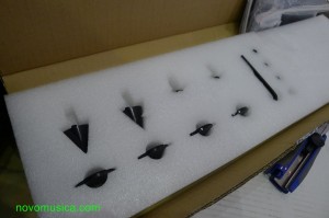 Si pretendes montar los altavoces tu solo, sin la ayuda de nadie, lo mejor será que abras el embalaje por la parte contraria a las indicaciones que nos da el fabricante Sonus Faber. De esta manera, después de abrir la caja si vuelvas el contenido te quedará como esta fotografía. La caja de cartón contiene todos lo que son las puntas de desacoplo, basecitas y tornillos varios. A la derecha vemos lo que es la base del altavoz.