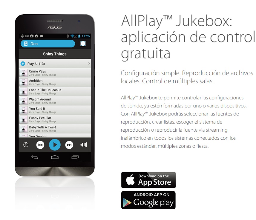 Además, es compatible con múltiples apps que permiten controlarlo de forma sencilla desde el teléfono móvil o tableta, tenga sistema operativo Android o Apple. Compatible con la plataforma AllPlay, es posible controlar cada uno de los ASUS Clique desde esta app, pero también se puede utilizar con otras como Spotify™, Napster™, SomaFM™, Aupeo™, Astro Player™, DR.fm™ y DoubleTwist™.