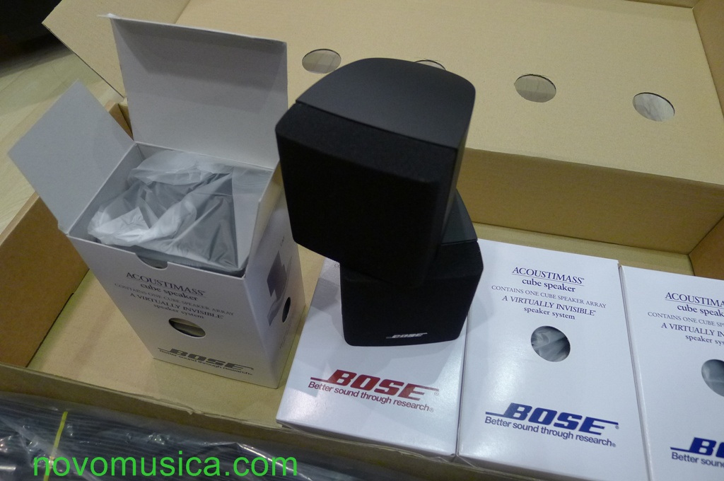 Vamos sacando cada uno de los cubitos dobles Bose. El hecho de que tenga dos cubitos y no solo uno como el sistema Bose AM6 SIII nos permitirá girar cada uno de ellos para crear lo que Bose ha denominado como “sonido directo reflejado” y es que de esta manera por medio de reverberaciones en la sala, la escena sonora que se crea es mucho más creíble y amplia. Los satélites están disponibles en color blanco, negro y en plata, en ésta última opcion el subwoofer será negro y en el resto, del mismo color que los altavoces. El altavoz o driver interno está protegido por una tela que ayuda a la dispersión de sonido. El recinto acústico que completa el altavoz está realizado en plástico y el recinto interno es un misterio. Bose no hace halagos ni de potencias y tiene mucho secretismo a la hora de mostrar los entresijos de sus realizaciones.