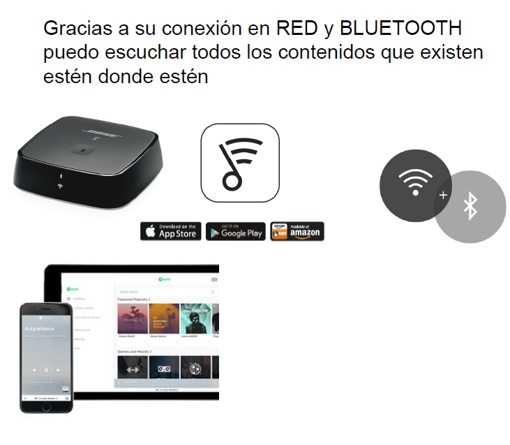 A simple vista puede ser una barra más de sonido, pero no te dejes engañar. Cuenta con una entrada HDMI con ARC y también una digital óptica, más que suficiente para poder conectar el TV o un reproductor BluRay. Además tiene Bluetooth y lo más importante, es compatible con el sistema de sonido inalámbrico SoundTouch. La gama de productos SoundTouch nos permite disfrutar libremente de música digital con radio por internet, Spotify y otros servicios. Pudiendo ser controlado desde un teléfono o tablet. Si añadimos otros altavoces compatibles con este sistema podremos crear un moderno y sofisticado hilo musical inalámbrico – Altavoces Bose SoundTouch