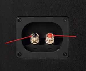 Después de hacer estas operaciones previas ya podremos meter sin problemas la banana de altavoz. Repetiremos esta misma acción de quitar el taponcillo con un borne del otro color. Si hemos hecho negro/negativo, ahora nos tocará hacerlo con el borne rojo/positivo. Aunque se podría conectar en el borne de la misma altura (el inferior) lo aconsejable es cruzarlos, así el amplificador atacará directamente agudos y medios/graves. En la siguiente fotografía veremos el resultado final