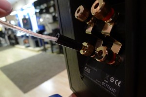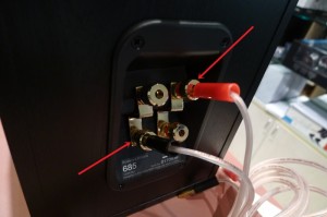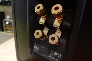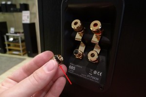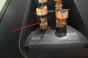 Para las fotografías hemos utilizado un altavoz B&W modelo 685, cuenta con cuatro bornes de altavoz unidos los dos del mismo color por medio de unos “puentes”. Estos puentes hay que dejarlos puestos.