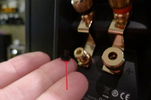 También nos podemos encontrar con otro tipo de altavoz a cuyos bornes se les pueda sacar el taponcillo fácilmente sin tener que desenroscar el borne el su totalidad. De hecho hay algunos bornes que tienen un límite y no se desenroscan del todo. Este caso ocurre por ejemplo en estos altavoces Boston Acoustics A26. Donde con solo meter un objeto punzante o un cutter como en la foto anterior podremos ya quitar el taponcillo para después meter la banan. Foto: