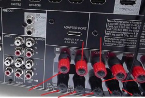 Esta foto inferior corresponde al amplificador de cine en casa Pioneer VSX-923, que viene de serie con los taponcillos puestos. Si queremos meter cable pelado desenroscamos el borne de altavoz, pero si queremos utilizar bananas será necesario el quitar los taponcillos.
