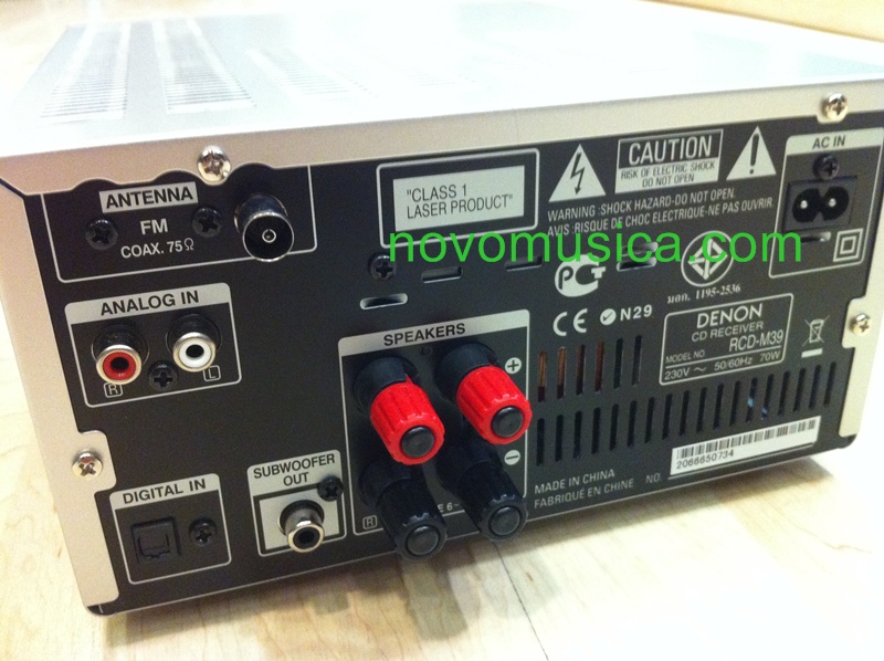 Sacada ya de su embalaje, el módulo de electrónica de esta micro cadena se denomina Denon RCD-M39. En las pegatinas frontales vemos las funciones que Denon ha querido destacar del equipo de sonido Denon DM39. USB compatible con iPhone e iPod, “european sound tuned” que viene a ser “construido con sonido europeo” y por último la gran novedad… lleva entrada auxiliar digital óptica! especialmente útil si queremos conectar el equipo a un televisor de última geración LED ya que tienen este tipo de salida de audio.