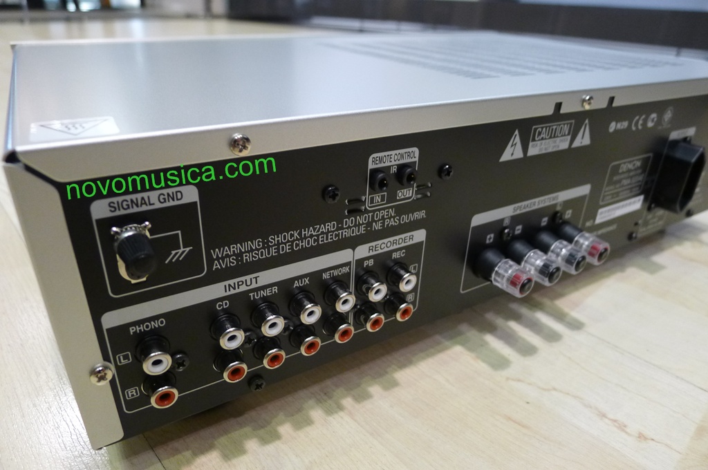 Viendo las conexiones del culete del amplificador estéreo Denon PMA-520, está preparado para poder conectar un giradiscos, de ahí que ponga “phono” y aparezca la toma de tierra “signal ground”. Otras entradas con las que cuenta son: CD, Tuner, Aux, Network y Recorder. Subiendo la vista un poco más hacia arriba hay unas conexiones mini-jack para conectar un trigger del amplificador Denon PMA520 a otro aparato Denon y que a la vez que se enciende uno, se encienda también el otro. Y ya por último los bornes de altavoz para colocar los altavoces. En la toma de alimentación de al fondo a la derecha podremos conectar otro aparato eléctrico.