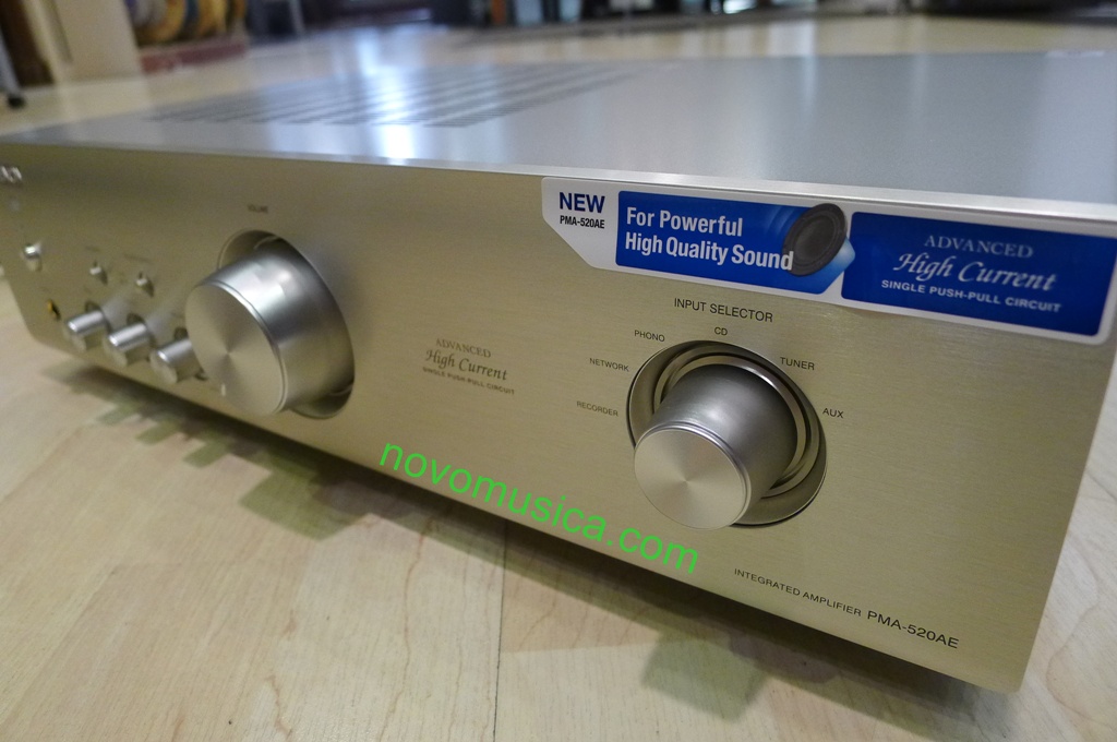 Por fin llegamos a una fotografía vista de cerca del amplificador Denon PMA-520AE y podemos ver cómo han prescindido del botón “Source Direct” que tenía el modelo PMA510 y en su lugar aparecen las letras ” Advanced High Current, Single Push-Pull Circuit” (en realidad no lo han eliminado, se lo han llegado al otro extremo del amplificador). En cuanto a las entradas, han eliminado una entrada “Recorder” y han puesto una nueva entrada correspondiente a los reproductores de audio en red, que han denominado “Network”.