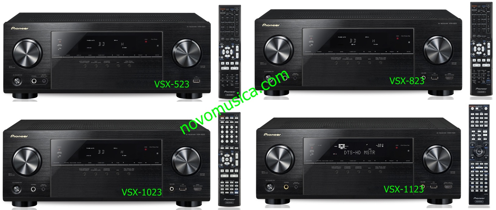 El modelo más sencillo de todos es el Pioneer VSX-523 que es bastante normalito y equivaldría al VSX-322 actual. Como novedad incluye una entrada USB frontal y se caracteriza por tener 4 entradas HDMI y una salida. Amplificación 5 x 80Watios RMS (140W a 6Ohm)
