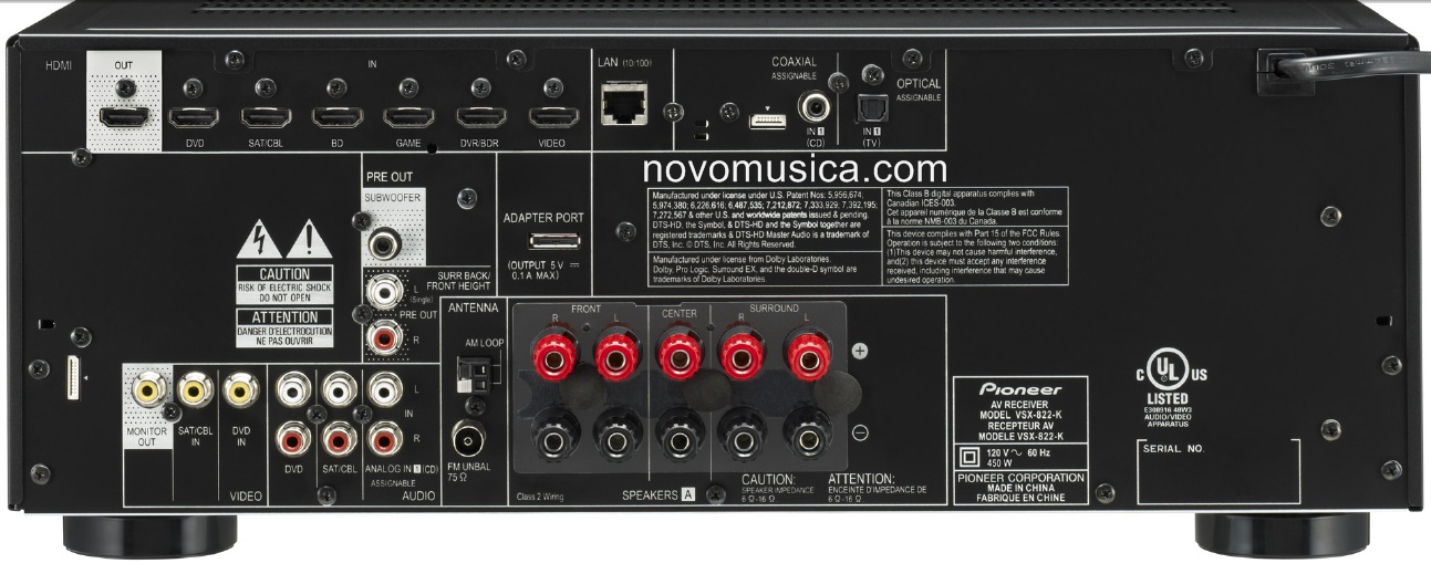 Si hacemos click en la imagen superior podremos comprobar lo bien servido que está el amplificador: 6 entradas HDMI v1.4, 1 salida HDMI compatible con ARC (canal de retorno de audio), conexión LAN/Ethernet lo que le hace compatible con DLNA 1.5, entrada digital coaxial digital y óptica que son asignables, 2 entradas de vídeo compuesto, 3 entradas de audio analógico, salida PreOut, salida de subwoofer, salida de vídeo Monitor Out, salida de auriculares, radio FM y AM, conexión especial para el adaptador Bluetooth AS-BT200