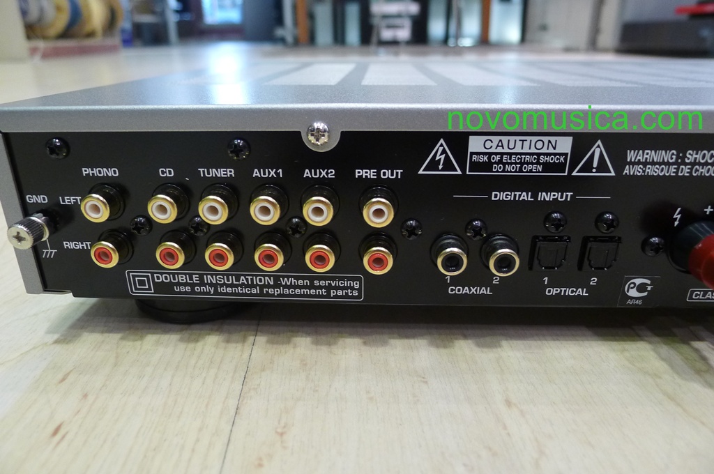 Las entradas analógicas con las que cuenta son un total de 4 a lo que hay que añadir una entrada extra que es el previo de phono para poder conectar un giradiscos. A lado vemos las entradas de audio digital, que son un total de 2. Aunque veamos cuatro conectores en realidad estas entradas son conmutables y deberemos elegir si queremos coaxial u óptica. Algo muy útil hoy en día ya que todos los televisores nuevos LED o Plasma tienen salida de audio digital óptica. Así no hará falta comprar un convertidor de digital a analógico. Esta es una de las grandes ventajas de este ampli.