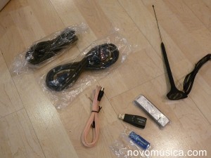 Estos son todos los accesorios que vienen de origen, de izquierda a derecha nos encontramos. Cable de red Europeo, cable de alimentación para UK, cable de antena FM, pincho USB, adaptador para conectar al USB posterior del aparato el cable DLNA que venga desde el router, adaptador WIFI para acceder a los contenidos de manera inalámbrica, y por último la antena para recibir emisoras digitales DAB.