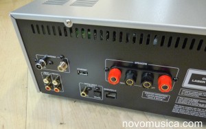 El culete del aparato, aunque ya he hablado antes de las conexiones que incorpora, las vuelvo a nombrar. Arriba a la izquierda tenemos la conexión de antena FM y la antena DAB dónde deberemos roscar la antenita larga. Debajo encontramos la entrada analógica esteréreo 2RCA y una salida PRE-OUT. La conexión USB posterior no está pensada para conectar un pincho, para eso está la conexión frontal, esta entrada se utiliza para conectar los diferentes adaptadores para enchufar a nuestra red WIFI ó nuestra red local por cable. Luego tenemos la entrada digital, deberemos elegir si lo vamos a hacer por coaxial ó por óptico. Al lado hay una conexión de con conector RJ45 que es exclusica del SAT, servicio técnico. Los bornes de altavoz para izquierdo y derecho.