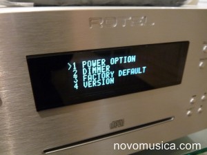 Desde el mando a distancia del Rotel RCX-1500 pulsamos el botón MENU y nos aparecen diferentes ajusted cómo 1-Power Option. 2-Dimmer para regular la intensidad de la luz del display. 3-Factory Default para volver a valores de fábrica y 4-Version para conocer la versión de sofwtare que lleva incorporado.