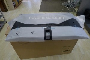El soporte Loewe Dynamic es un soporte fijo Loewe, que consta de dos patitas que van situadas y atornilladas justo debajo de los altavoces y una pieza central a modo de pie para sujetar el televisor por detrás. Aunque como podrás observar en las fotografías no hemos montado este soporte sino el soporte Loewe Table Stand CID, que es giratorio y permite un poco de cabeceo. De ahí que en la fotografía que se muestra más abajo se vean dos embalajes distintos. El embalaje del televisor es más delgado que otros televisores como puede ser el Loewe Art 40 3D pues al no incoporar soporte de serie montado, permite que no ocupen tanto los corchos interiores.