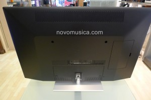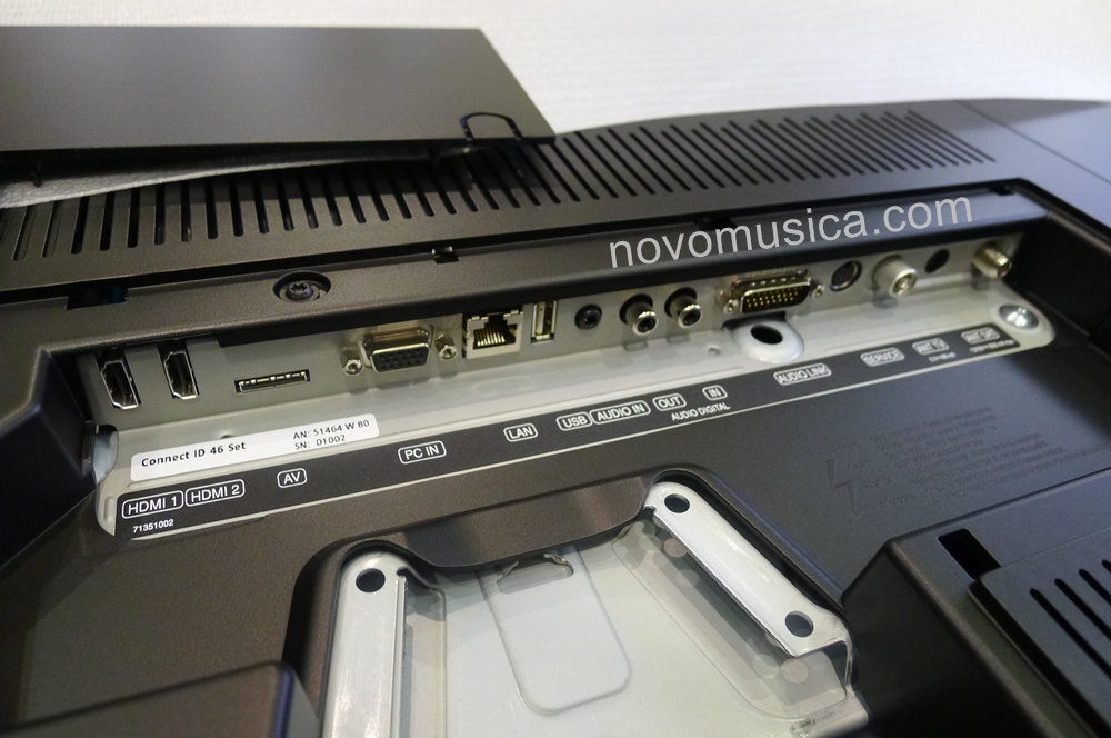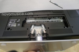 conexiones loewe connect ID46Una vez montado el soporte, ya que viene en dos piezas por separado, lo sujetaremos al televisor por medio de cuatro tornillos. Si hemos situado el televisor encima de la caja, como hemos hecho nosotros en la tienda, es importante ser precavido no vaya a ser que se nos venza hacia atrás el embalaje y tengamos un disgusto.